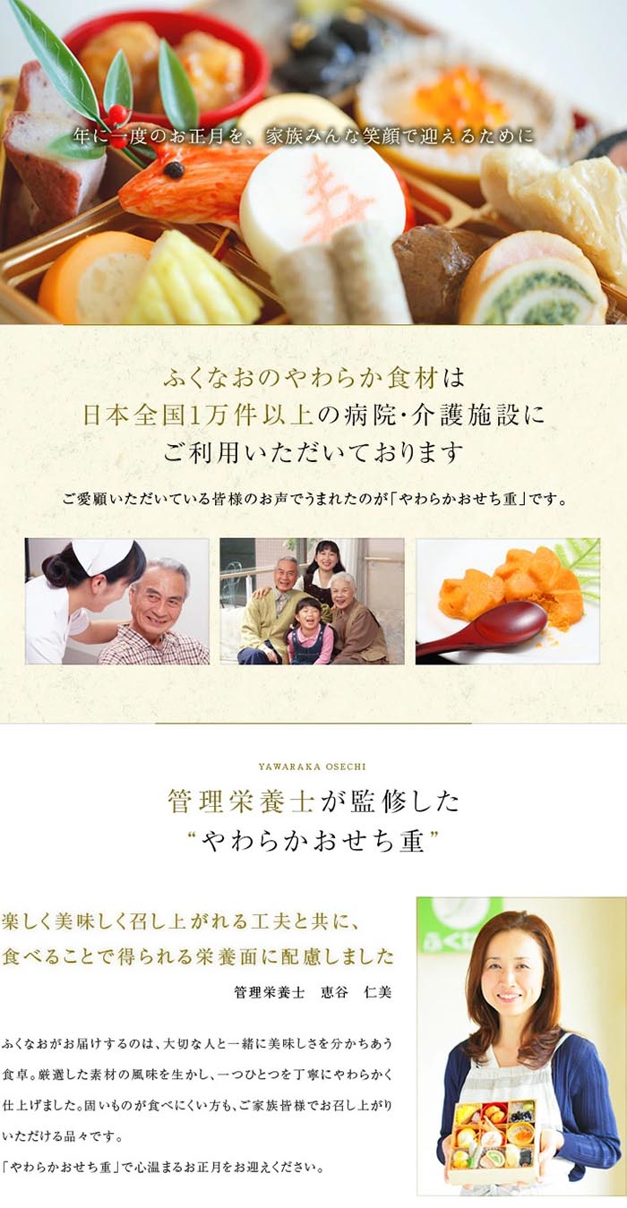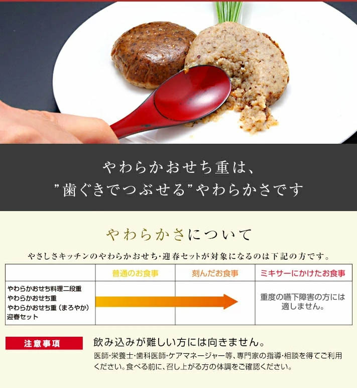 | やわらかおせち重 | やわらか豆腐白玉入りおしるこ | さっくり餅入り雑煮 | |