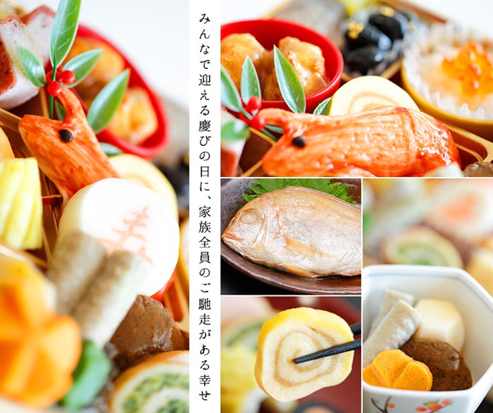 ■エビチリソース煮 えび(インドネシア)、ねぎ、トマトケチャップ、砂糖、醤油、清酒、植物油、生姜ペースト、にんにくペースト、トウバンジャン、食塩、酵母エキス/増粘剤(加工デンプン、増粘多糖類)、トレハロース、リン酸塩(Na)、重曹、着色料(パプリカ粉末、カラメル、紅麴)、酸味料、(一部にえび・小麦・大豆を含む) ■やわらか豚角煮 豚肉(デンマーク)、 清酒、醤油、砂糖、水あめ、生姜ペースト、醤油加工品(醤油、砂糖)、にんにくペースト、酵母エキス/増粘剤(加工デンプン、キサンタンガム)、着色料(カラメル)、 重曹、リン酸塩(Na)、(一部に小麦・大豆・豚肉を含む) ■抹茶ムース 牛乳(国産)、乳等を主要原料とする食品、抹茶ペースト(水飴、果糖ブドウ糖液糖、抹茶)、砂糖/トレハロース、ゲル化剤(増粘多糖類、加工デンプン)、香料、着色料(紅花黄、クチナシ、金箔)、(一部に乳成分・大豆を含む) ■きんとん 生あん(ライマメ)(国内製造)、砂糖、オリゴ糖/着色料(クチナシ) ■黒豆 黒大豆(中国)、砂糖、還元水飴、醤油、食塩/硫酸鉄、(一部に小麦・大豆を含む) ■ふわふわ伊達巻 魚肉(輸入)、鶏卵、砂糖、大豆油、卵白、乾燥卵黄、豆乳、食塩、醤油/トレハロース、加工デンプン、グリシン、着色料(カロチノイド、カラメル)、調味料(アミノ酸等)、乳化剤、増粘剤(グァー)、マンニット、(一部に小麦・卵・大豆を含む) ■やわらか海老の艶煮 魚肉(たい(ベトナム)、えび)、大豆油、砂糖、食塩、醤油、みりん、発酵調味料、えびパウダー/加工デンプン、セルロース、着色料(紅麹、カラメル、カロチノイド)、増粘剤(加工デンプン)、調味料(アミノ酸等)、ポリリン酸Na、乳化剤、(一部にえび・小麦・大豆を含む) ■寿かまぼこ 魚肉(輸入)、液卵白、大豆油、砂糖、食塩/加工デンプン、グリシン、調味料(アミノ酸等)、着色料(紅麹、カロチノイド)、乳化剤、増粘剤(グァー)、(一部に卵・大豆を含む) ■湯葉のちりめん山椒和え 湯葉(タイ製造)、ちりめん山椒佃煮、砂糖、醤油、食塩/ソルビット、調味料(アミノ酸等)、リン酸塩(Na)、(一部に小麦・大豆を含む) ■やわらか昆布巻 魚肉(輸入、日本)、昆布、砂糖、大豆油、醤油、還元水飴、液卵白、発酵調味料、食塩、大豆たん白/加工デンプン、着色料(炭末、紅麹、カラメル)、調味料(アミノ酸等)、増粘剤(加工デンプン、グァー)、乳化剤、(一部に小麦・卵・さけ・大豆を含む) ■ほぐし魚の西京焼 魚肉(輸入)、調味味噌、大豆油、液卵白、清酒、砂糖、発酵調味料、ゼラチン、食塩、大豆たん白/加工デンプン、グリシン、pH調整剤、調味料(アミノ酸等)、増粘多糖類、着色料(カロチノイド)、(一部に卵・ゼラチン・大豆を含む) ■里芋六方の煮物 里芋(中国)、発酵調味料、砂糖、醤油、米酢、食塩/トレハロース、調味料(アミノ酸等)、pH調整剤、グリシン、(一部に小麦・大豆を含む) 発酵調味料(国内製造)、砂糖、醤油、米酢、食塩/増粘剤(加工デンプン)、トレハロース、調味料(アミノ酸等)、pH調整剤、グリシン、(一部に小麦・大豆を含む) ■やわらかごぼうの煮物 ごぼう(中国)、ごぼうピューレ、大豆油、卵白、でん粉、砂糖、醤油、発酵調味料、乾燥卵白、食塩/加工デンプン、増粘多糖類、調味料(アミノ酸等)、ソルビット、乳化剤、pH調整剤、グリシン、(一部に小麦・卵・大豆を含む) ■なごみ巻(ほうれん草) 液卵白(国内製造)、魚肉、ほうれん草、大豆油、ほうれん草ペースト、砂糖、食塩、発酵調味料、醤油、小麦たん白/加工デンプン、調味料(アミノ酸等)、ソルビット、増粘多糖類、pH調整剤、膨張剤、グリシン、(一部に小麦・卵・大豆・やまいもを含む) ■椎茸しんじょうの煮物 干し椎茸(中国製造)、椎茸、魚肉、砂糖、みりん、食塩、大豆油、椎茸エキスパウダー、醤油/加工デンプン、着色料(カラメル、炭末)、調味料(無機塩)、乳化剤、(一部に小麦・大豆を含む) 発酵調味料(国内製造)、砂糖、醤油、食塩/増粘剤(加工デンプン)、pH調整剤、調味料(アミノ酸等)、グリシン、(一部に小麦・大豆を含む) ■ふんわり高野豆腐 こうや豆腐(国内製造)、砂糖、醤油、食塩、煮干しエキス、昆布エキス、鰹節エキス/調味料(アミノ酸等)、炭酸K、リン酸塩(Na)、(一部に小麦・大豆を含む) ■花形人参の煮物 人参(中国)、大豆油、小麦デンプン、乾燥卵白、砂糖、食塩/加工デンプン、増粘剤(カードラン、加工デンプン)、調味料(アミノ酸等)、pH調整剤、グリシン、(一部に小麦・卵・大豆を含む) ■なます ゆず風味 いくら添え 大根(国産)、米酢、砂糖、ゆず皮/pH調整剤、調味料(アミノ酸等)、グリシン いくら(北海道産)、醤油、発酵調味料、砂糖、食塩、醸造酢/調味料(アミノ酸等)、(一 部に小麦・いくら・大豆を含む) ■さっくりお餅雑煮 もち米粉(国産)、魚肉、大豆油、卵白、砂糖、食塩/加工デンプン、増粘剤(グァー)、(一部に卵・大豆を含む) 干し椎茸(中国製造)、椎茸、魚肉、砂糖、みりん、食塩、大豆油、椎茸エキスパウダー、醤油/加工デンプン、着色料(カラメル、炭末)、