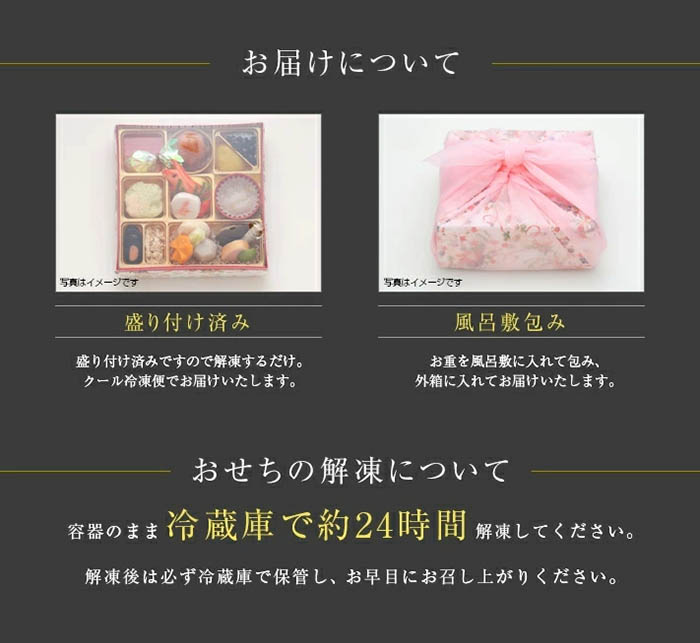 こちらは同梱不可商品です。おせちのみでのご注文をお願いいたします。 おせち以外の商品を一緒にご注文されますと、お届け出来かねますのでご注意ください。 |