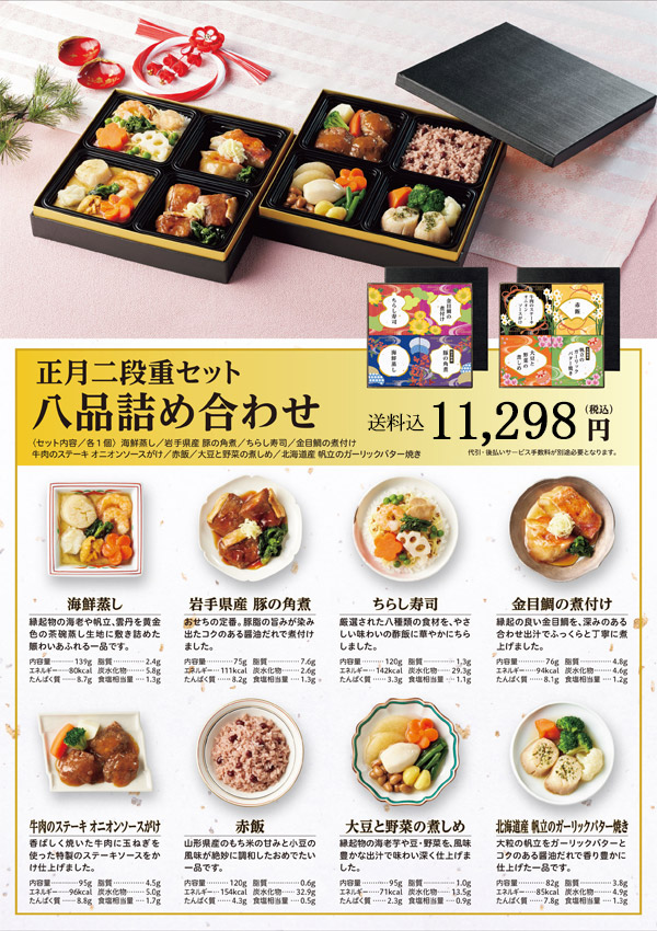| 内容量 | 8種セット(海鮮蒸し143g、岩手県産豚の角煮75g、ちらし寿司121g、赤飯120g、大豆と野菜の煮しめ95g、北海道産ホタテのガーリックバター焼き78g、金目鯛の煮付け77g、牛肉のステーキ オニオンソースがけ95g) |