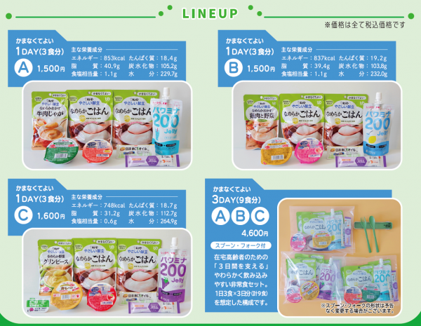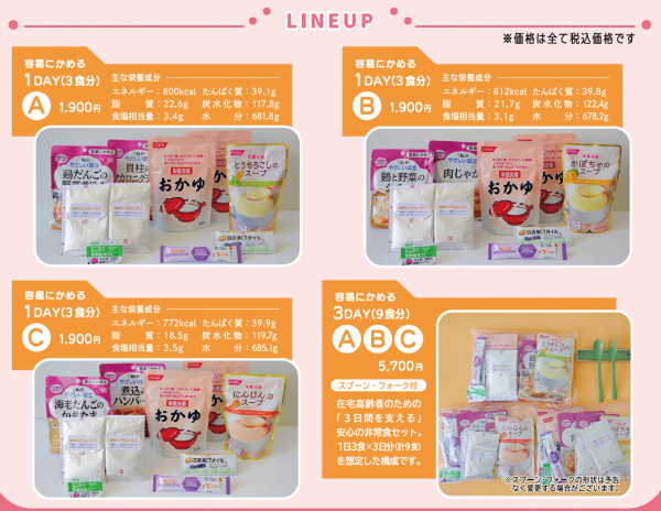 災害時でも必要な栄養量を確保できるよう、1日分(1DAY)や3日分(3DAY)のセットとして、栄養バランスまで考慮して構成されています 。