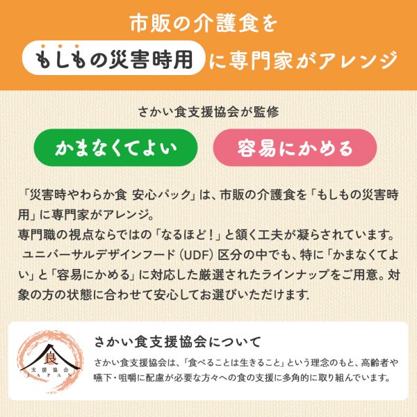 在宅で介護をされている皆様へ: 「もしも」の時の不安を安心に変えるために、日々の備えの一つとして、「災害時やわらか食安心パック」の備蓄をご検討ください。